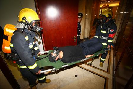 云梯车高空救人,,,,,,“伤员”用担架抬出